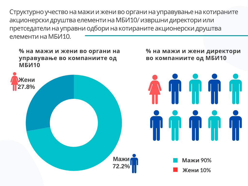 Во МБИ10 компаниите, 27,8% од членовите на органите на управување се жени, а само една компанија е управувана од жена извршен директор или претседател на управен одбор.
