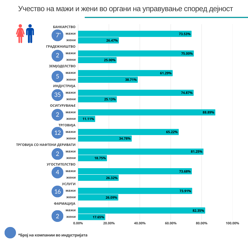 Овој графикон го покажува соодносот на мажи и жени во органите на управување на котираните компании, поделени по дејност. Разликата е најизразена во дејностите осигурување, фармација и трговија со нафтени деривати.