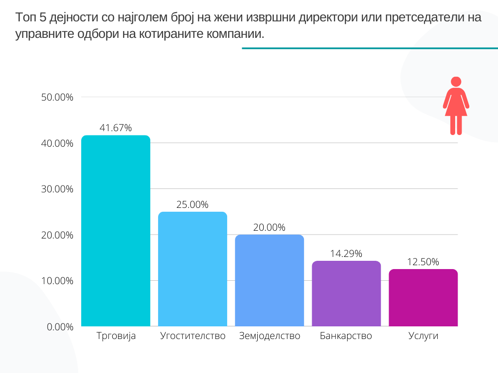 Најголем број на жени извршни директори или претседатели на управните одбори кај котираните компании има во дејностите трговија, угостителство, земјоделство, банкарство и услуги.