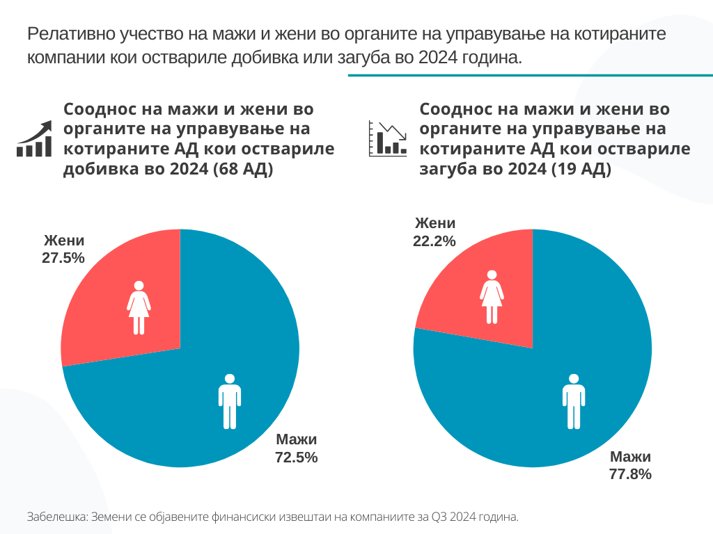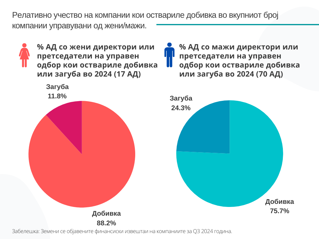 Котираните компании управувани од жени директори или претседатели на управен одбор, во 2024 година, почесто оствариле добивка, во споредба со котираните компании управувани од мажи.