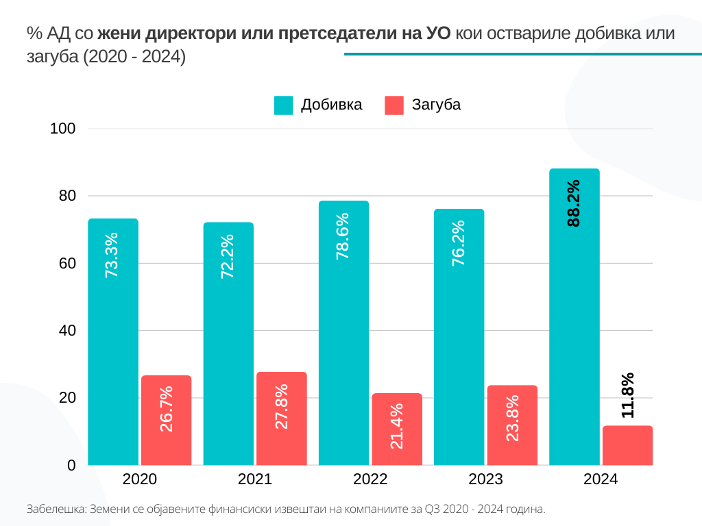 Трендот дека котираните компании управувани од жени директори или претседатели на управени одбори почесто остваруваат добивка е најизразен во 2024 година.