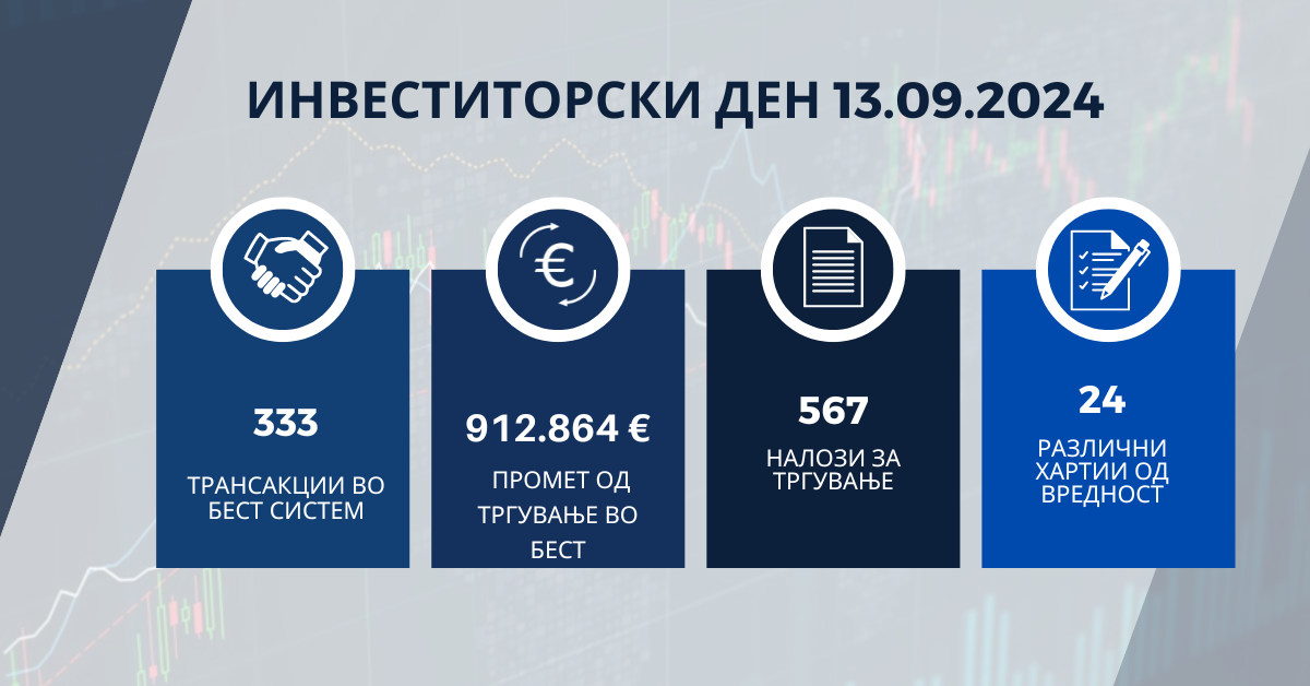 Вкупниот промет од тргување во БЕСТ системот со акции денес надмина 912 илјади евра, односно изнесува околу 56 милиони денари што е зголемување за повеќе од 53% во споредба со прометот остварен на инвеститорскиот ден одржан во 2023 година. Дополнително, денес во БЕСТ системот на Берзата се внесени вкупно 567 налози за тргување, што претставува повторно најголем број на внесени налози во берзанскиот систем за тргување во текот на оваа година.
