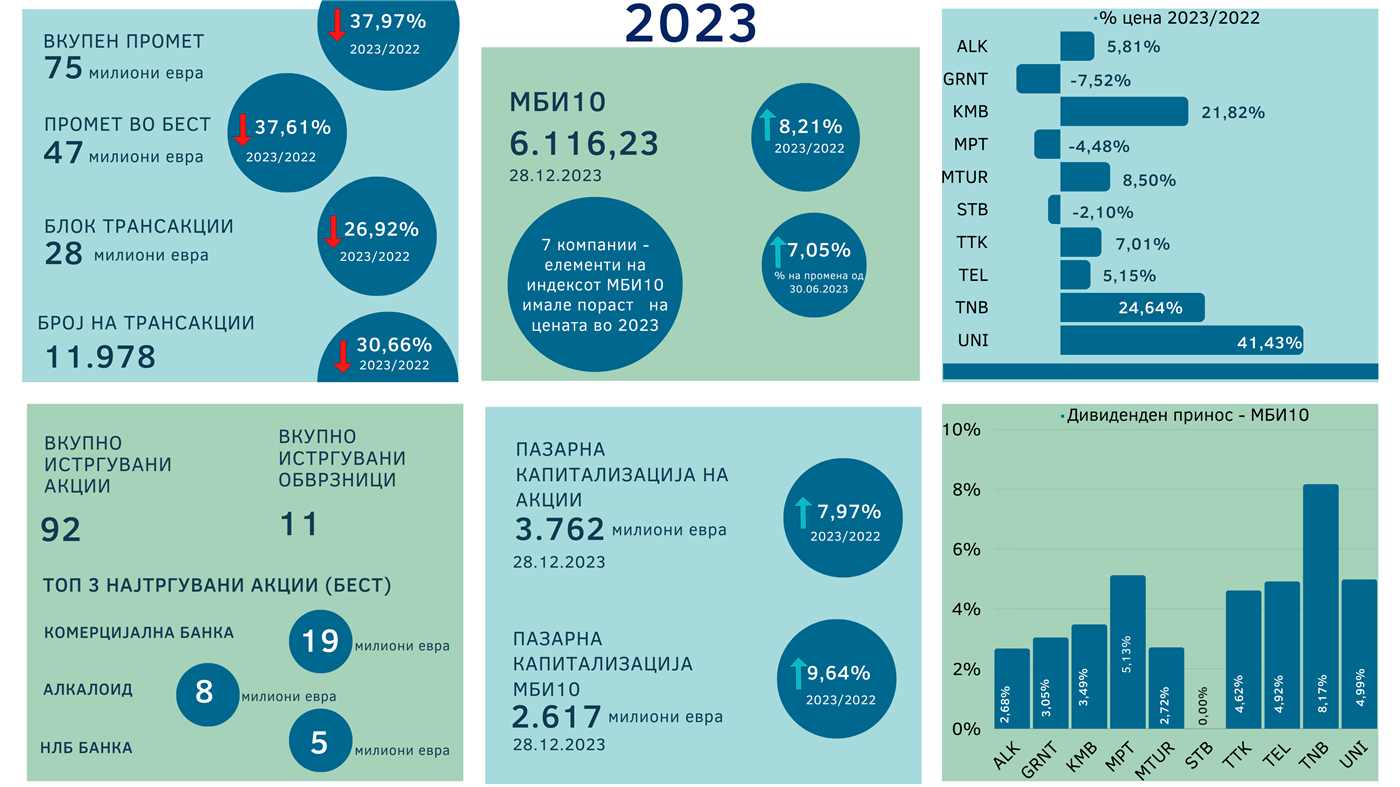 Детални информации за берзанските податоци и движења за 2023 година може да најдете во годишниот билтен на следниот линк