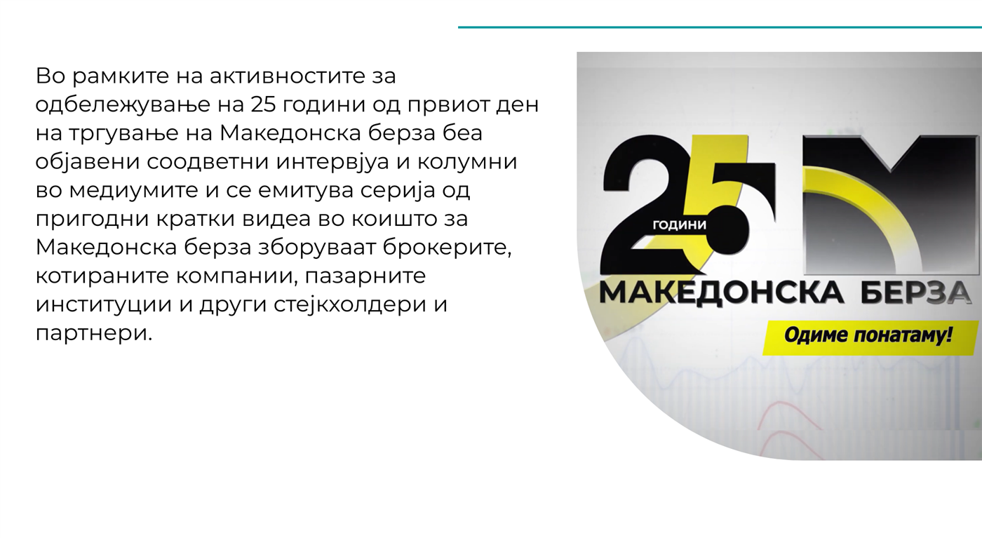 На крајот на март 2021 година Македонска берза одбележа 25 години од првиот ден на тргување којшто се одржа на 28.03.1996 година.