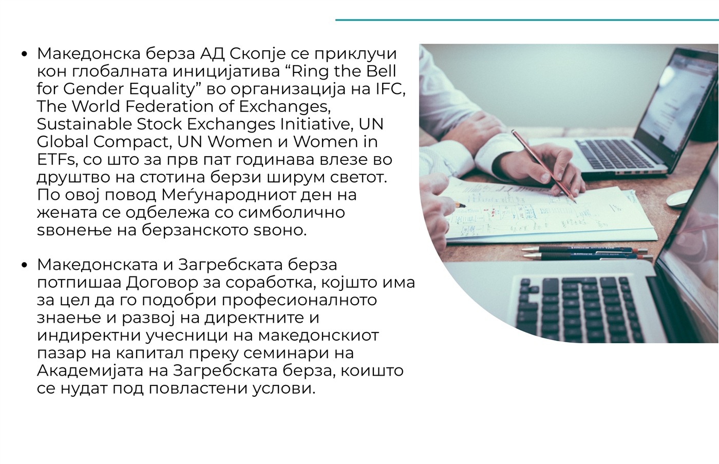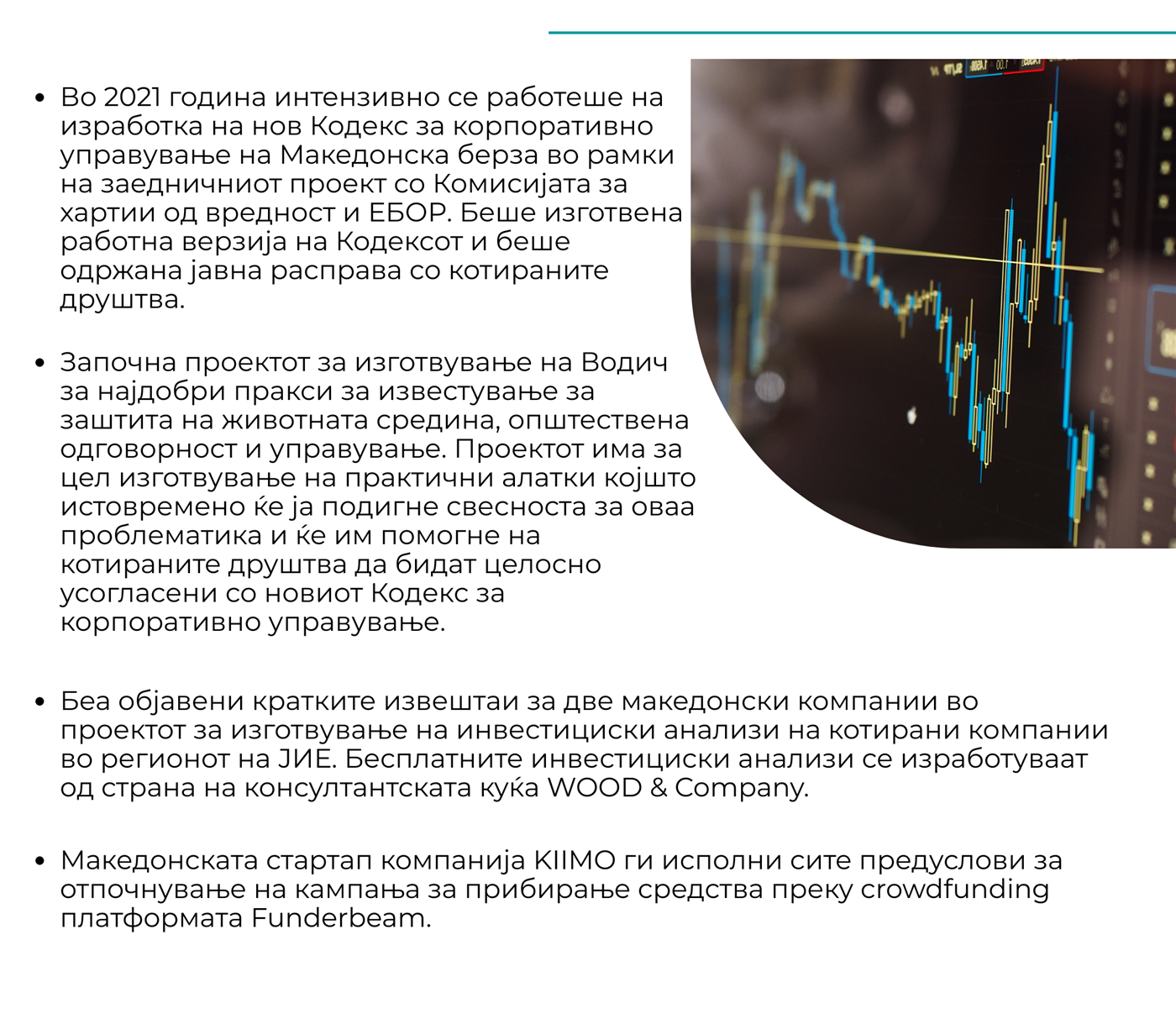 Изминатото полугодие од 2021 година беше одбележано и со отпочнување и/или продолжување на неколку значајни стратешки проекти што Берзата ги реализира самостојно или во соработка со различни странски партнери.