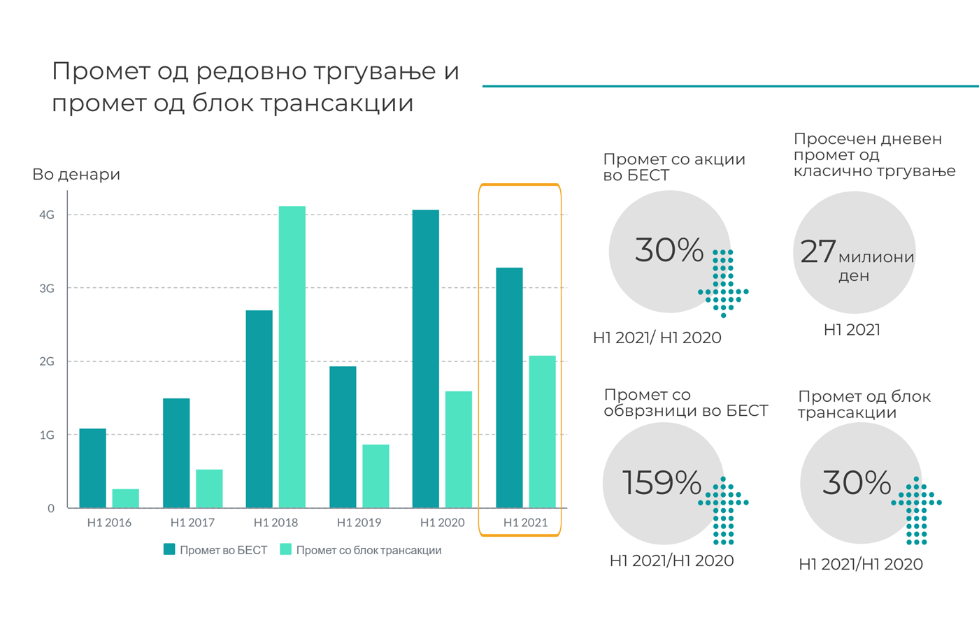 Вкупниот берзански промет по сите основи во првата половина на 2021 година изнесува околу 87 милиони евра, што претставува намалување од 8% наспроти истиот период лани кога изнесуваше 95 милиони евра. Ова благо намалување се должи на помалиот промет со акции во БЕСТ системот оваа година, при што битно е да се нагласи дека минатата година во март и април на пазарот беа забележани исклучително високи акциски промети како последица на прогласената пандемија на COVID-19,. Од друга страна, годинава голем пораст се забележува во тргувањето со обврзници од 159% (минатата година изостана редовната годишна котација на обврзниците за денационализација). Исто така, пораст бележи и прометот од блок трансакции којшто споредено со претходната година бележи раст од 30%. Доколку се анализира структурата на прометот во последните неколку години може да се заклучи дека вкупниот промет и со акции и со обврзници од класичното тргување во БЕСТ системот во првата половина од 2021 година (во износ од 53 милиони евра) е втор најголем берзански промет по овој основ во последните 5 години (најмногу се тргувало токму минатата пандемиска 2020 година).