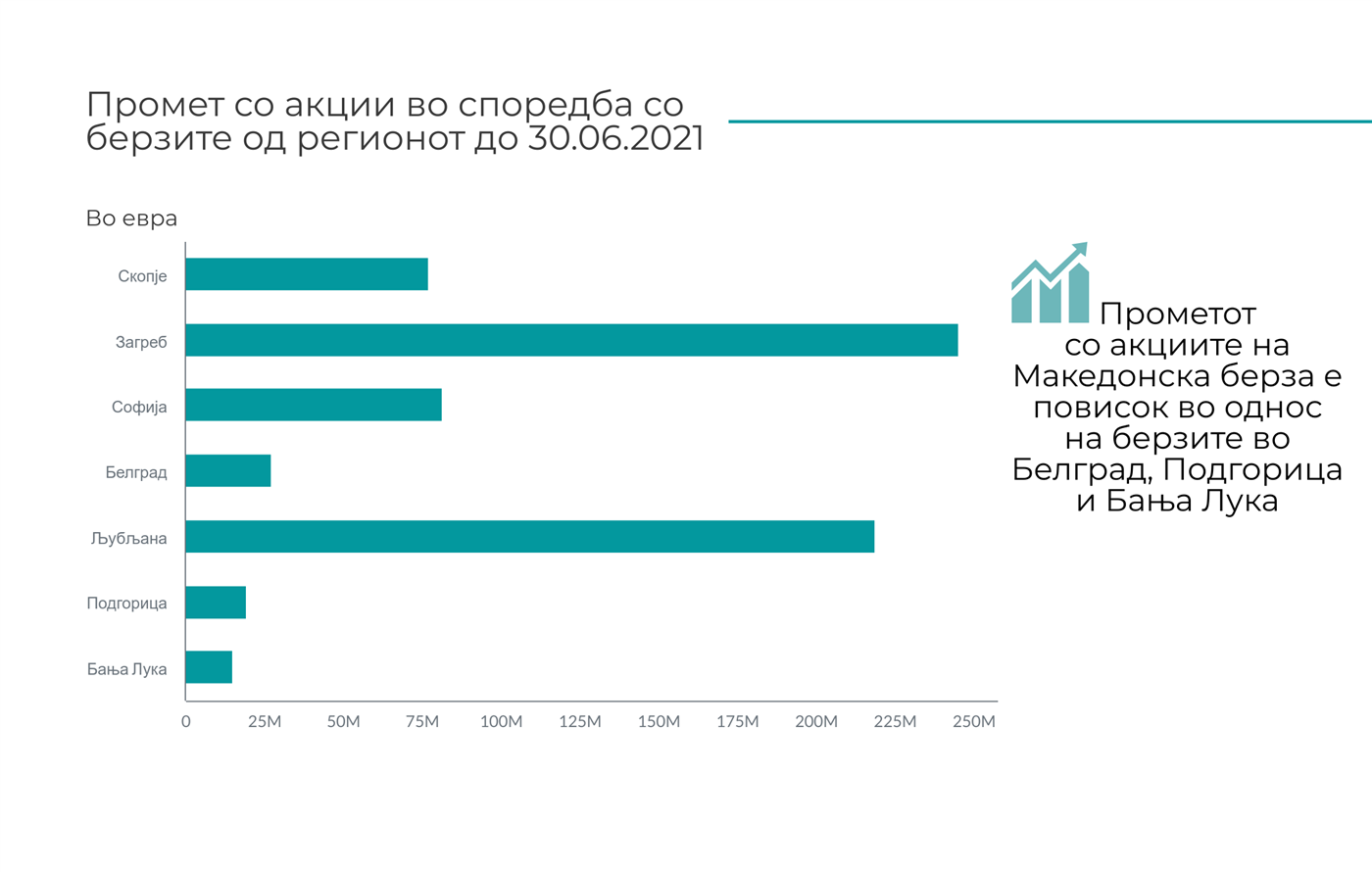 Компаративната регионална анализа покажува дека акцискиот промет на Македонска берза (акциите се главен финансиски инструмент со коишто се тргува и на другите регионални пазари) во првиот семестар од 2021 година е повисок од берзите во Белград, Подгорицa и Бања Лука, а е на слично ниво со берзата во Софија. Вообичаено, регионалниот примат во оваа категорија на промет го имаат берзите од Загреб и Љубљана.