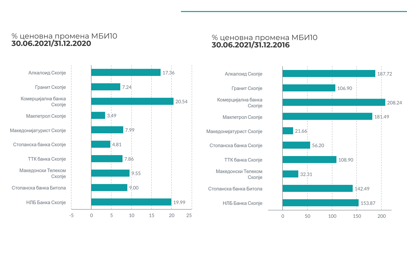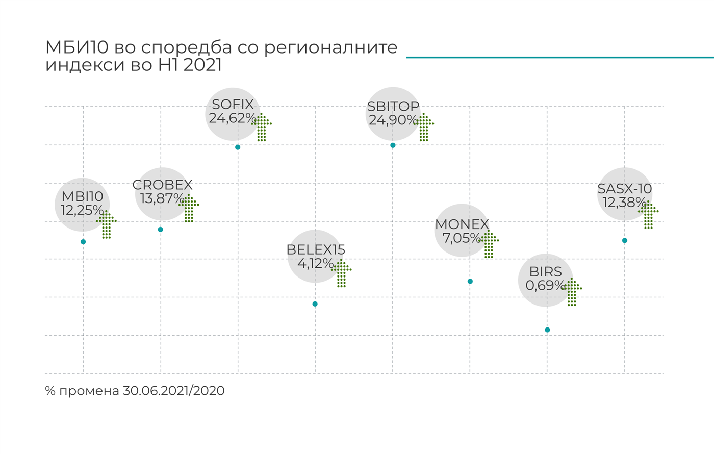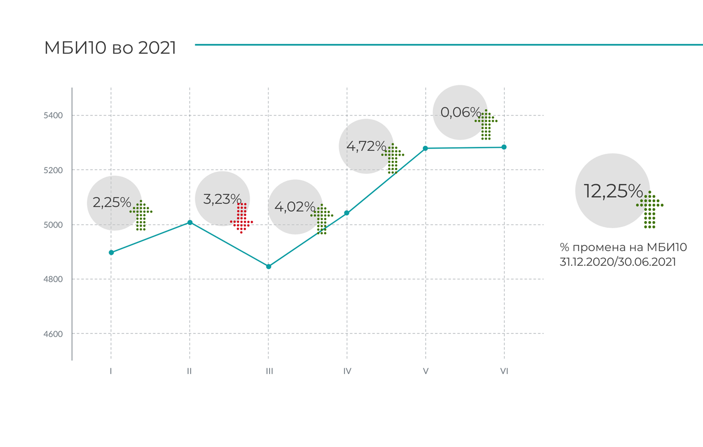 Во текот на првата половина од 2021 година индексот МБИ10, со исклучок на месец февруари, продолжи континуирано да расте и споредбено со крајот на 2020 година, на 30.06.2021 година изнесуваше 5.281,14 индексни поени, односно повторно забележа двоцифрен пораст од 12,25%.