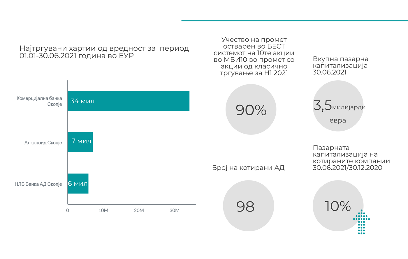 Учеството на прометот остварен во БЕСТ системот на десетте акции од индексот во вкупниот промет со акции во класичното тргување во првата половина на 2021 година изнесува 90%. Најтргувани хартии од вредност во овој период беа акциите на Комерцијална банка, со вкупен промет по сите основи од 34 милиони евра, потоа следат акциите на Алкалоид со вкупен промет од околу 7 милиони евра и акциите на НЛБ Банка АД Скопје со вкупен промет од околу 6 милиони евра.