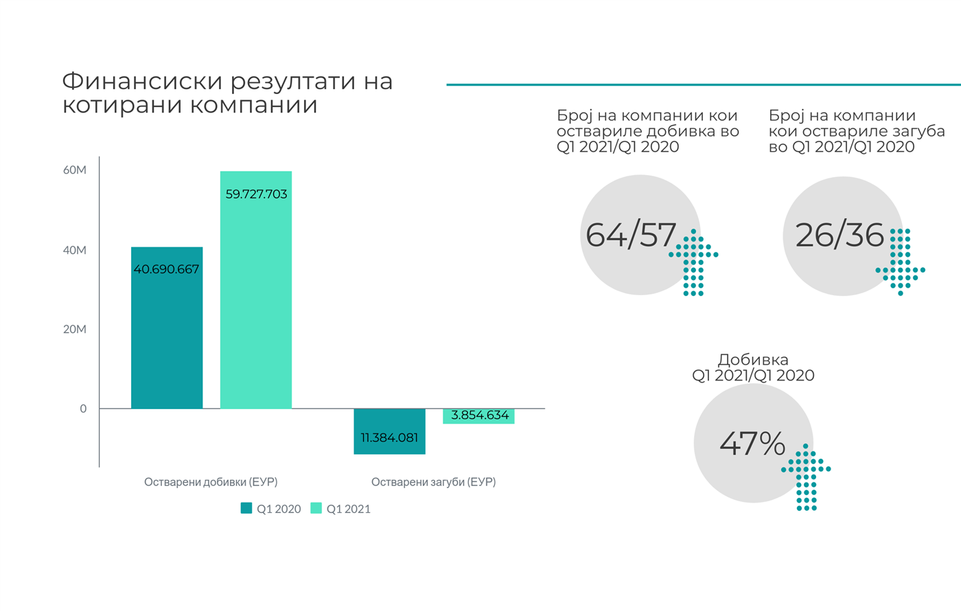 Во текот на првото полугодие од 2021 година беа објавени финансиските резултати на котираните компании за првиот квартал од 2021 година. Од 98 котирани компании, 64 регистрирале добивка, 26 загуба, 4 компании не доставиле финансиски извештај, додека 4 друштва се долгорочно суспендирани од котација. Вкупната прикажана добивка на котираните компании во Q1 2021 година е зголемена за околу 47% споредено со истиот период лани.