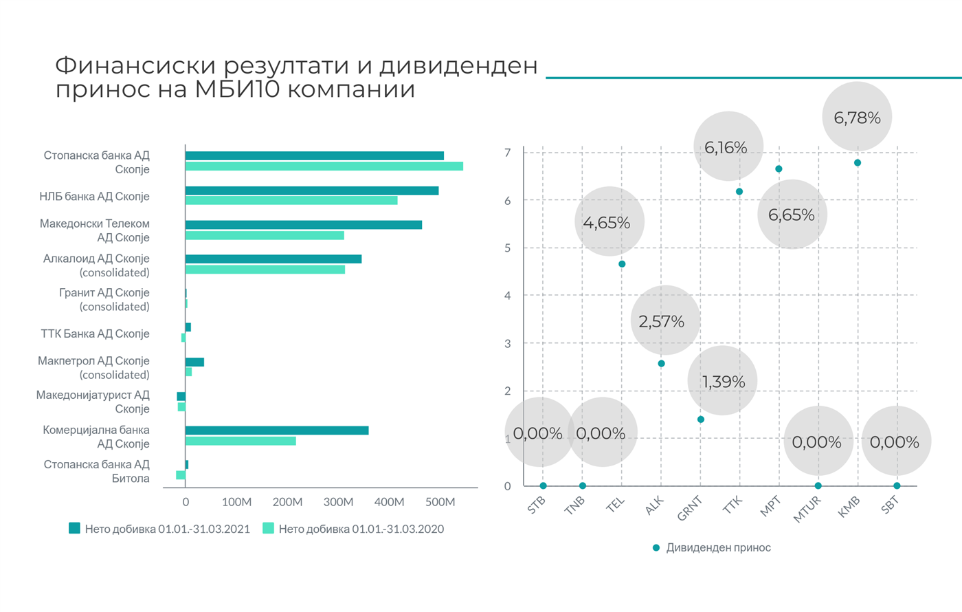 Првата половина од 2021 година беше и период на одржување на годишните собранија на акционери. Од десетте компании, елементи на МБИ10 индексот, шест компании донесоа одлука за исплата на дивидиенда, при што дивидендниот принос се движи помеѓу 1,39% и 6,78%.