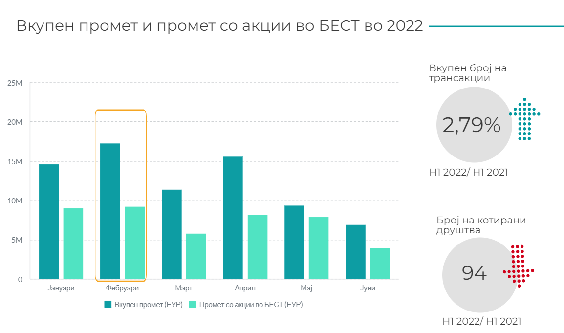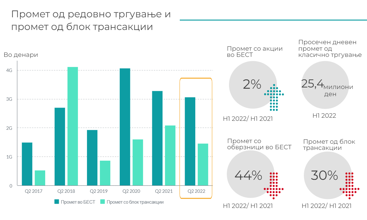 Вкупниот берзански промет по сите основи во H1 2022 година изнесува околу 75 милиони евра, што претставува намалување од 13,6% наспроти истиот период лани. Во тие рамки, прометот со акции во БЕСТ системот во првото полугодие оваа година изнесува околу 44 милиони евра и е за 2% поголем во однос на истиот период 2021 година. Просечниот дневен промет во првото полугодие од 2022 година изнесува 25,4 милиони денари и бележи намалување од 7% во однос на истиот период минатата година, додека просечниот дневен број на трансакции е речиси идентичен како и минатата година и изнесува 85 трансакции дневно. Главниот причинител за намалениот вкупен промет е помалата вредност на блок трансакциите, односно оваа година овој промет изнесува околу 1,5 милијарди денари наспроти ланското остварување од нешто околу 2 милијарди денари.