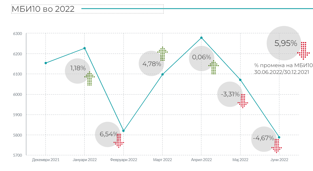 Перформансата на индексот МБИ10, што го мери општото ниво на цените на најликвидните десет акции на Македонска берза, во првата половина од 2022 година бележи пад од 5,95%, во однос на последната вредност на индексот на крајот на 2021 година. Доколку се анализира по месеци, после порастот во јануари (1,18%), во февруари, поради почетокот на војната во Украина индексот бележи пад од 6,54%, додека во март и април се зголемува за 4,78% и 0,06%, соодветно. Во месеците мај и јуни индексот бележи дополнителен пад, односно -3,31% во мај и -4,67% во јуни. Највисоката вредност на индексот во првата половина од оваа година изнесуваше 6.364,81 индексни поени (на 09.02.2022 година), додека најниската вредност на индексот беше 5.627,16 поени (на 24.02.2022 година).