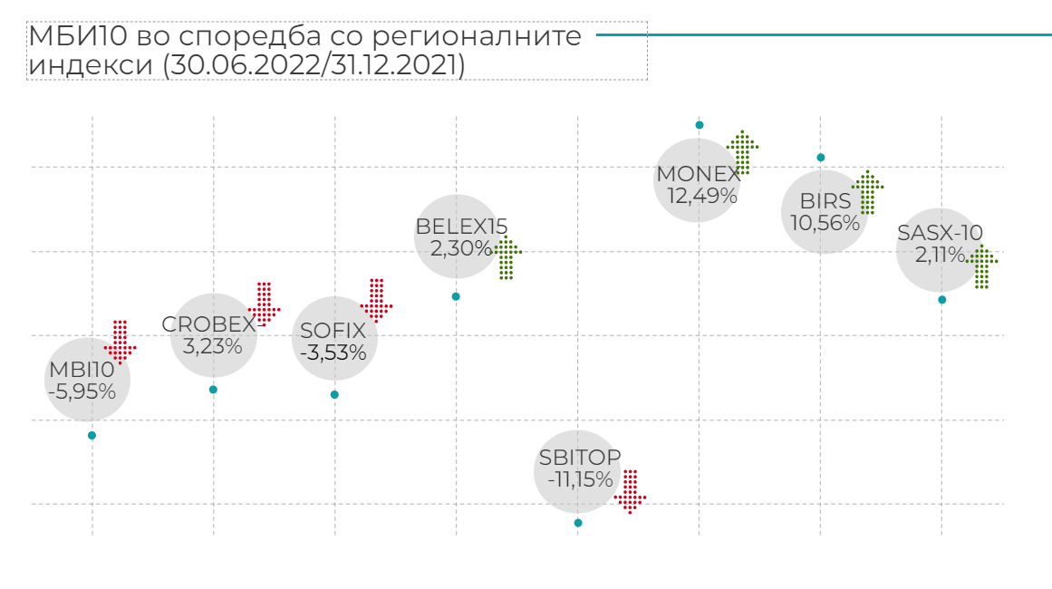 Регионалната анализа на берзанските индекси покажува дека во Н1 2022 година МБИ10 е во групата на поразвиените регионални берзи, чии индекси имаат негативни перформанси – што е разбирливо имајќи ги предвид севкупните економски и гео-политички фактори во кои работат и глобалните и регионалните пазари на хартии од вредност.