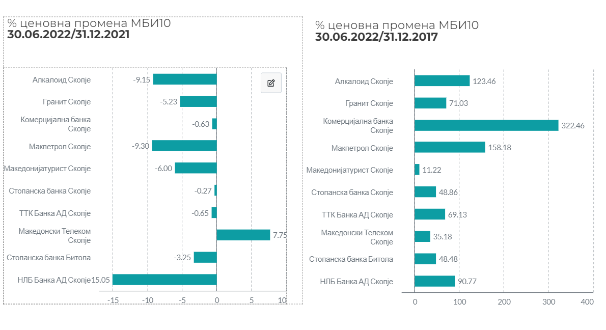 Анализата на ценовните движења на поединечните акции од актуелниот состав на МБИ10 индексот во првите шест месеци од 2022 година покажува дека само акциите издадени од Македонски Телеком АД Скопје бележат пораст (7,75%). Кај останатите акции, елементи на МБИ10, се забележува надолна корекција на цените во опсег до максимум -15%. Во продолжение е прикажана ценовната перформанса на сите елементи на МБИ10 во првата половина од 2022 година.