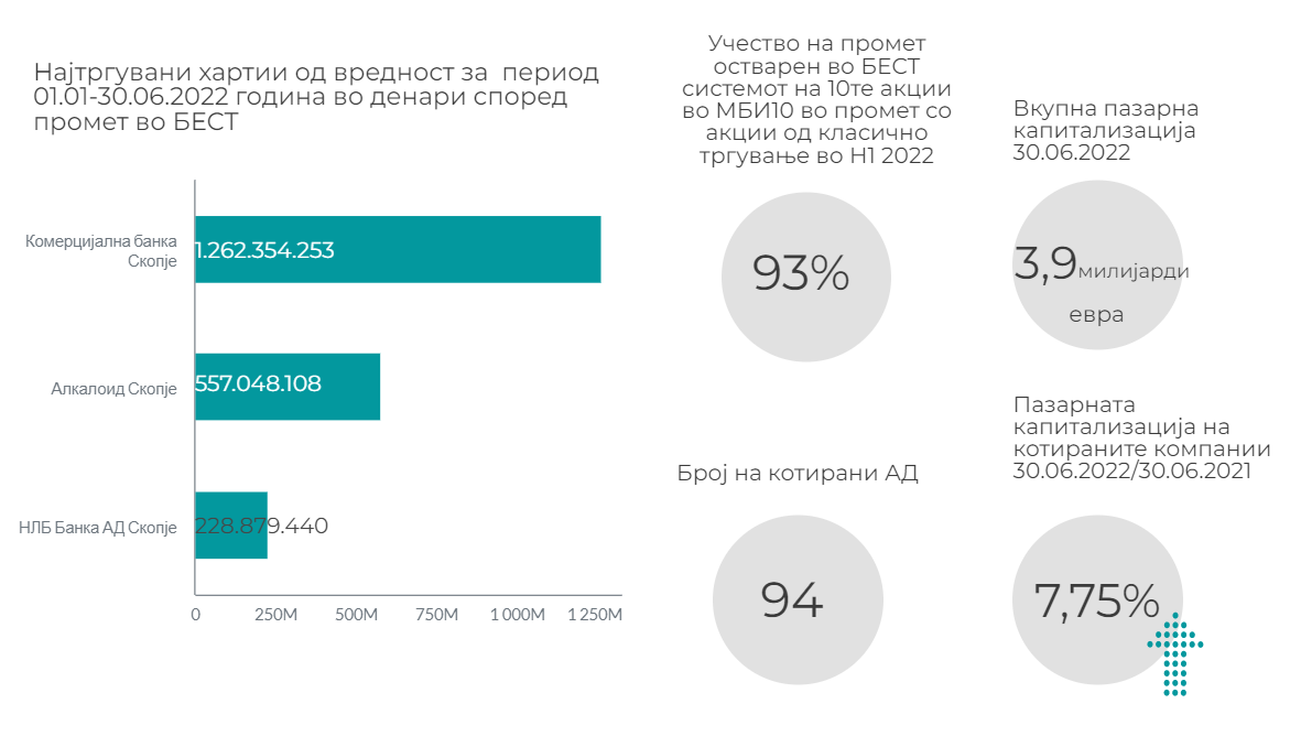 Најтргувани хартии од вредност во H1 2022 година се акциите издадени од Комерцијална банка, со вкупен промет по сите основи од 20 милиони евра, потоа следат акциите издадени од Алкалоид АД Скопје со вкупен промет од околу 9 милиони евра и акциите на НЛБ Банка АД Скопје со вкупен промет од околу 4 милиони евра. Учеството на прометот остварен во БЕСТ системот на десетте акции во МБИ10 индексот во прометот со акции од класично тргување во БЕСТ системот за првите шест месеци од 2022 година изнесува 93% - е вообичаено висока концентрација на класичното берзанско тргување во овие акции.