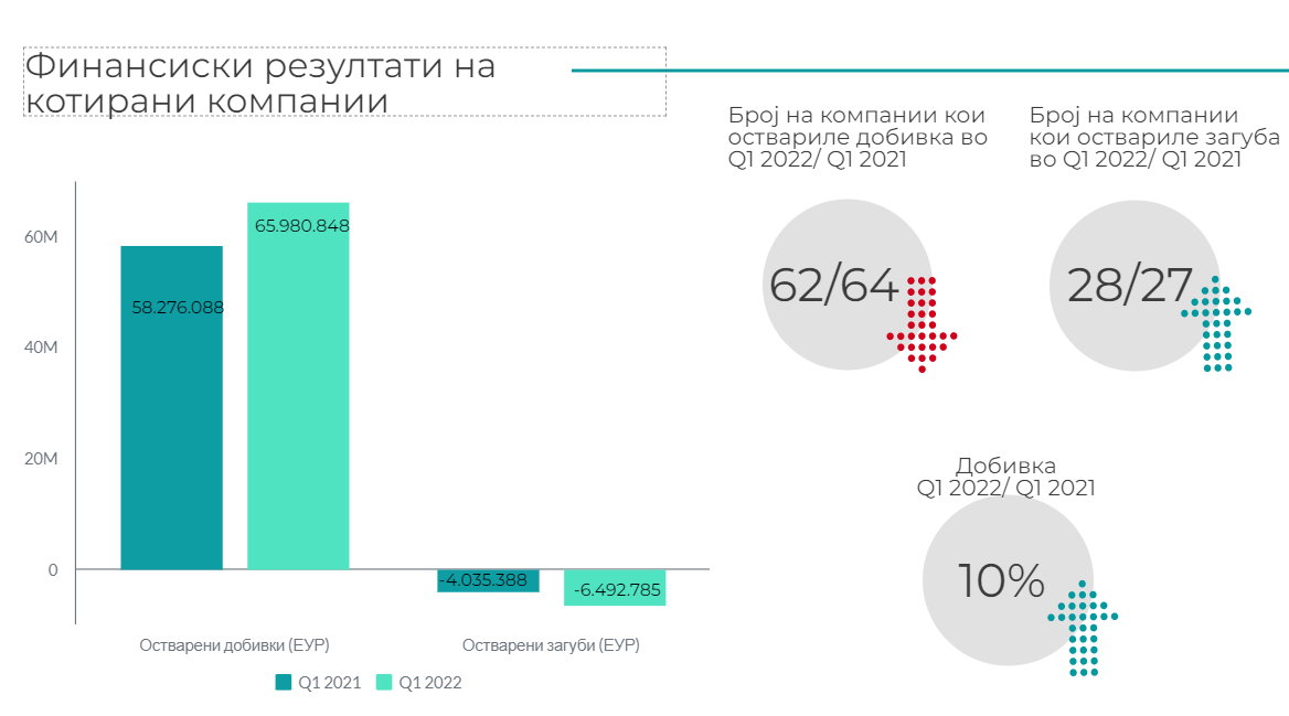 До крајот на мај беа објавени и неревидираните финансиски резултати на котираните компании за првиот квартал од 2022 година. Од 94 котирани компании, 62 регистрираа добивка, 28 загуба, 1 друштво не објавило извештај, додека 3 компании се во режим на долгорочна суспензија од котација. Вкупната прикажана нето добивка на котираните компании за Q1 2022 година е зголемена за околу 9,67% споредено со Q1 2021 година.