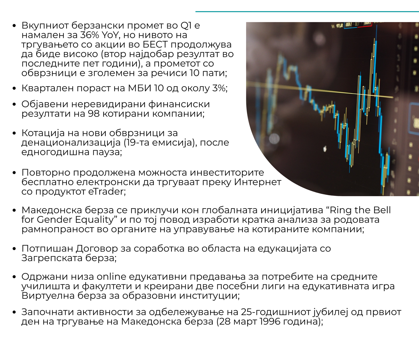 Во првиот квартал од 2021 година, започнаа активностите за одбележување на 25 години од првиот ден на тргување на Македонска берза (28 март 1996 година). Беа објавени соодветни интервјуа и колумни во медиумите, а се започна и со емитирање на серија од пригодни кратки видеа во кој за Македонска берза ќе зборуваат брокерите, котираните компании, пазарните институции и други домашни и странски стејкхолдери и партнери.