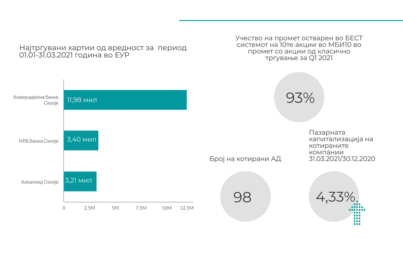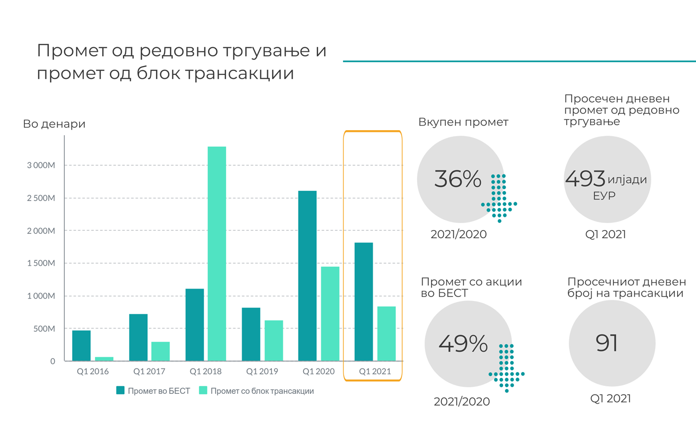 Вкупниот берзански промет по сите основи во Q1 2021 година изнесува околу 43 милиони евра, што претставува намалување од 36% наспроти истиот период лани кога вкупниот промет изнесуваше 68 милиони евра. Основна причина за ваквото намалување е екстремно високиот промет со акции во март минатата година поради големата ценовна осцилаторност што настана лани како последица од избувнување на пандемијата. Консеквентно, прометот со акции во БЕСТ системот во првиот квартал оваа година изнесува околу 21 милиони евра и е за 49% помал во однос на истиот период 2020 година. Ваков тренд се забележува и кај просечниот дневен број на трансакции којшто во првиот квартал од 2021 година изнесува 91, додека просечниот дневен промет во Q1 од 2021 година изнесува околу 493 илјади евра.