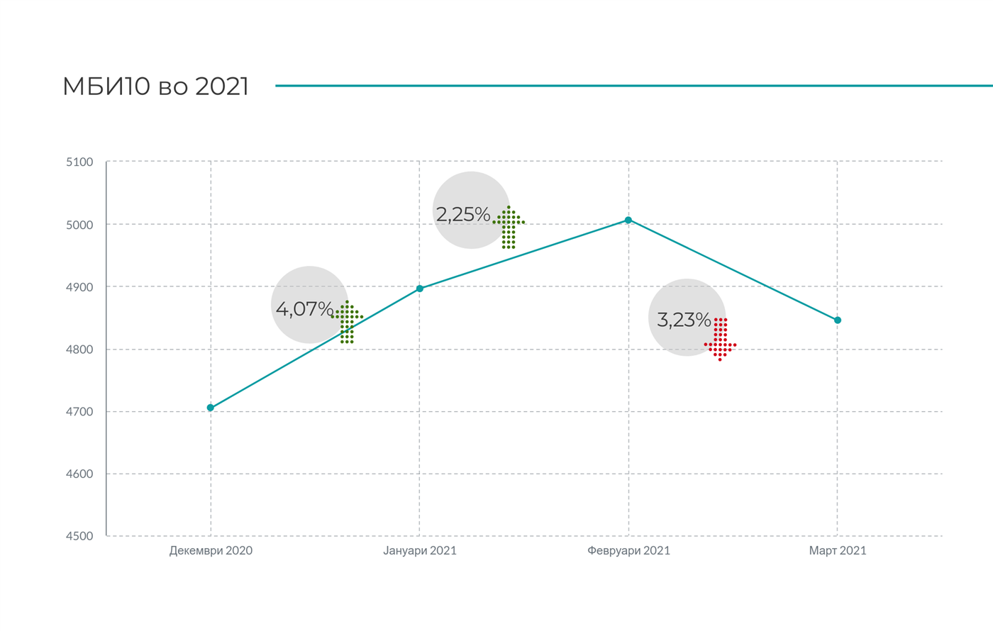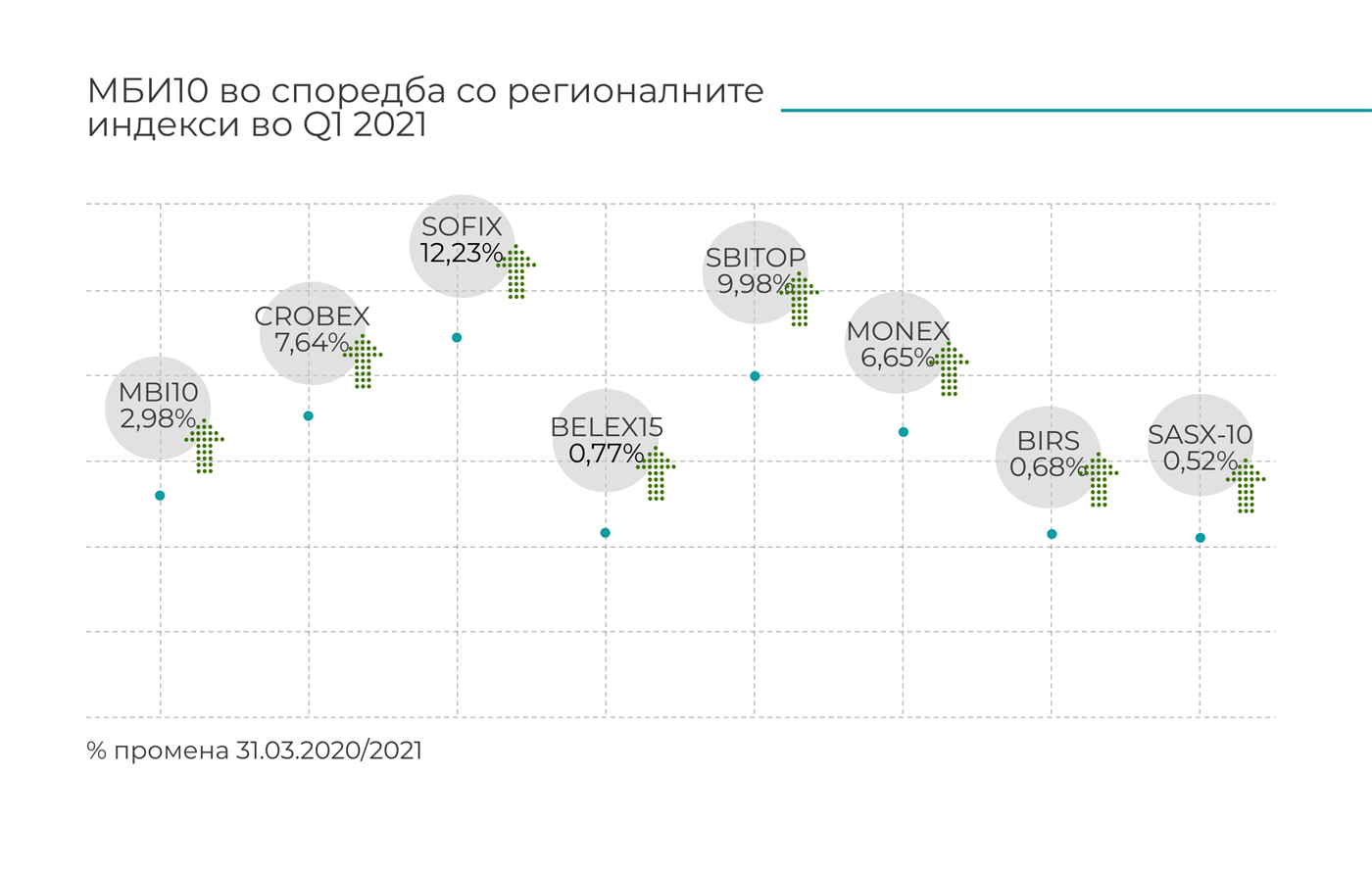 Перформансата на индексот МБИ10, што го мери општото ниво на цените на најликвидните десет акции на Македонска берза, во првиот квартал од 2021 година бележи пораст од 2,98%, споредено во однос на последната вредност на индексот на крајот на 2020 година. Доколку се анализира по месеци после порастот во јануари (4,07%) и февруари (2,25%), во март индексот бележи пад од 3,23%. Највисоката вредност на индексот во Q1 изнесуваше 5.150,20 индексни поени (на 17.02.2021 година), додека најниската вредност на индексот беше 4.710,31 поен (на 04.01.2021 година).