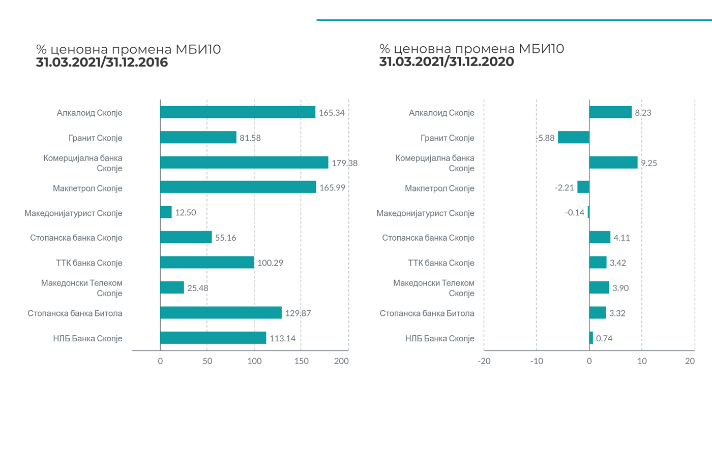 Анализата на ценовните движења на поединечните акции од актуелниот состав на МБИ10 индексот во три месеци од 2021 година покажува дека акциите издадени од Комерцијална банка АД Скопје бележат најголем пораст (9,25%). Потоа следат акциите издадени од Алкалоид АД Скопје (8,23%) и Стопанска банка АД Скопје (4,11%). Само кај три акции, елементи на МБИ10 се забележува надолна корекција на цените. Во продолжение е прикажана ценовната перформанса на сите елементи на МБИ10 во првиот квартал од 2021 година.