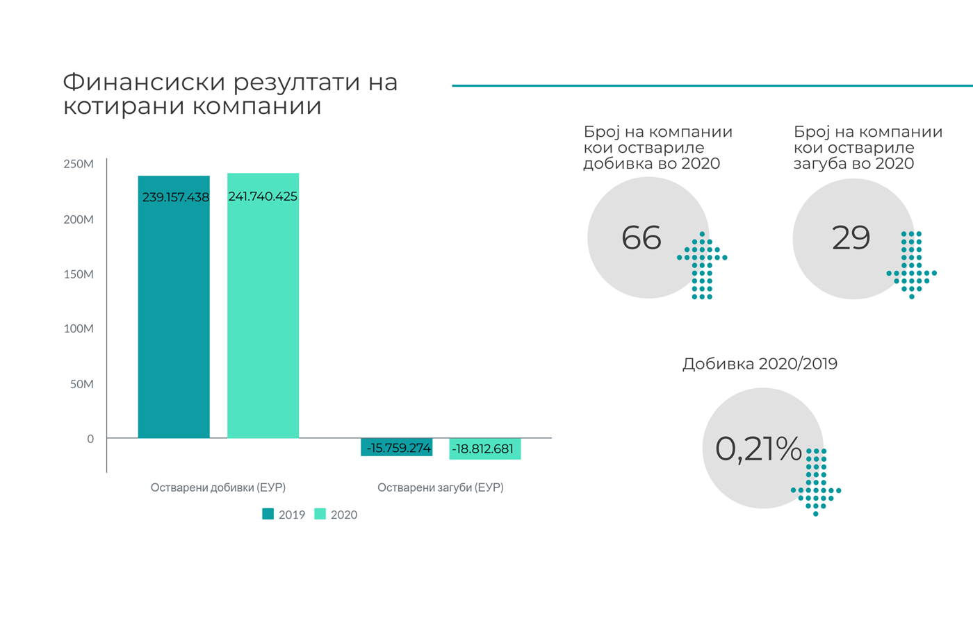 До крајот на март беа објавени и неревидираните финансиски резултати на котираните компании за 2020 година. Од 98 котирани компании, 66 регистрирале добивка, 29 загуба, додека 3 компании не доставиле финансиски извештај (за истите ќе следат соодветни санкции). Вкупната прикажана нето добивка на котираните компании за 2020 година е намалена за околу 0,21% споредено со 2019 година.