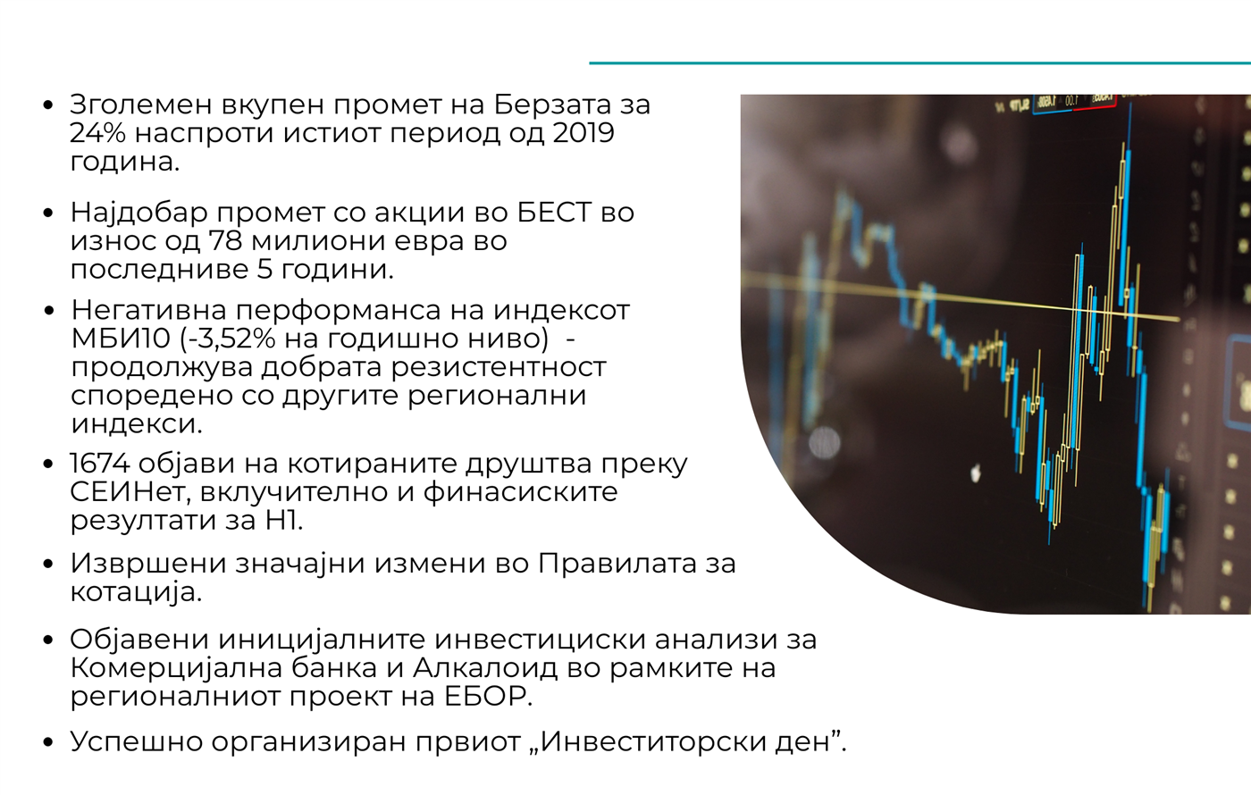 Во рамките на регионалниот проект на ЕБОР за изготвување на инвестициски анализи на котирани компании, во кој учествува и Македонска берза, во септември беа објавени иницијалните инвестициски анализи за Комерцијална банка АД Скопје (со препорака Buy) и Алкалоид АД Скопје (со препорака Hold), подготвена од страна на консултантската компанија WOOD & Company. Објавувањето на овие анализи влијаеше на динамизирање на тргувањето со овие акции и нивните ценовни движења.