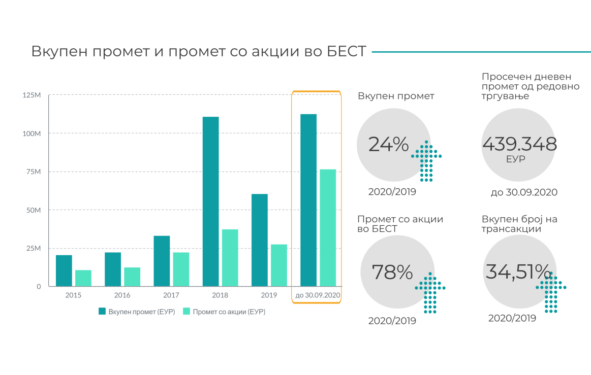 Вкупниот берзански промет по сите основи од почетокот на годината до 30 септември изнесува околу 113 милиони евра, што претставува зголемување од 24% наспроти истиот период лани кога изнесуваше 91 милиони евра. Во тие рамки прометот со акции во БЕСТ системот во овој период изнесува околу 78 милиони евра и е за 78% поголем во однос на истиот период 2019 година. Анализата повторно, како и во првото полугодие, покажува дека годинава прометот со акции во класичното тргување е најголем во последните 5 години. Истиот тренд се забележува и кај просечниот дневен број на трансакции којшто во 2020 година изнесува 101, додека просечниот дневен промет во првите девет месеци од 2020 година изнесува околу 27 милиони денари.