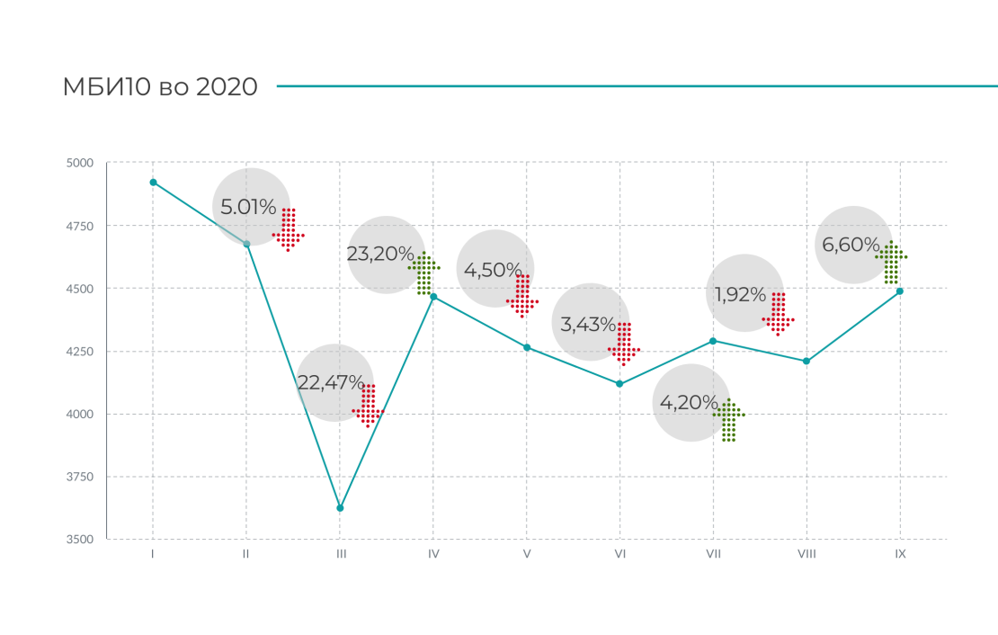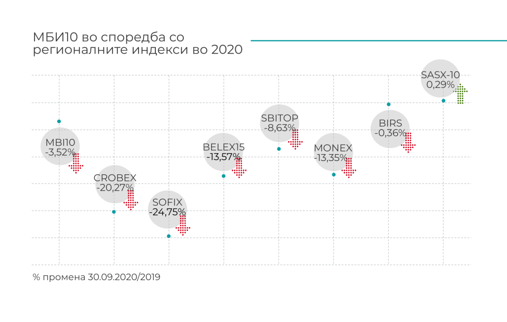 Перформансата на индексот МБИ10, што го мери општото ниво на цените на најликвидните десет акции на Македонска берза, по нагласената ценовна корекција во март (-22,47%) и априлската позитивна перформанса (+23,2%), во понатамошниот дел од годината регистрираше извонредно мала осцилаторност, за во септември повторно да се придвижи во нагорна линија (+6,60%) и на 30.09.2020 година да изнесува 4.485,18, што претставува доста благ пад од 3,52% на годишно ниво во однос на последната вредност на индексот на крајот на 2019 година.