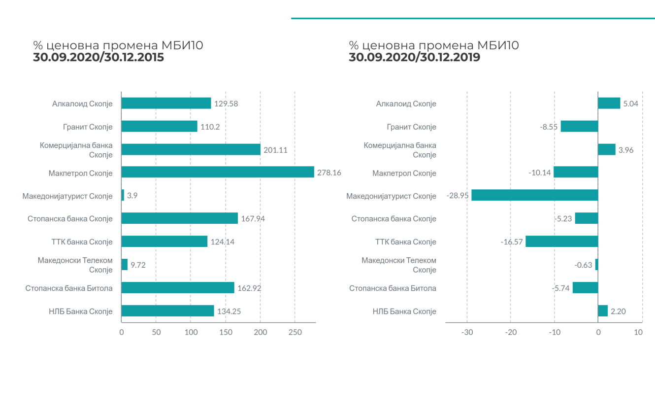 Анализата на движењата на поединечните акции од актуелниот состав на МБИ10 индексот во деветте месеци од 2020 година покажува дека само кај три акции се забележува пораст, додека кај останатите има надолна корекција на цените. Воедно, подолу е прикажана и ценовната перформанса на овие акции во последните пет години.