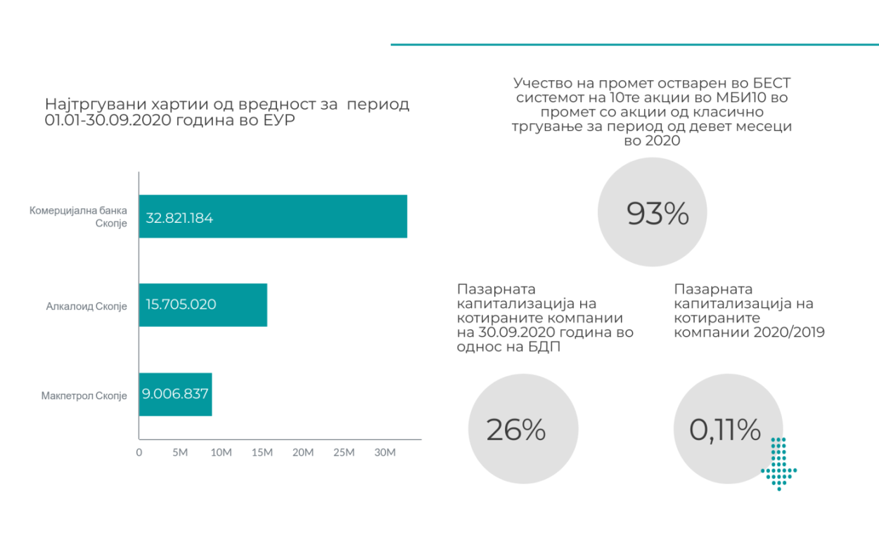 Најтргувани хартии од вредност за период 01.01-30.09.2020 година беа акциите издадени од Комерцијална банка, со вкупен промет по сите основи од 32,81 милиони евра, потоа следат акциите издадени од Алкалоид со вкупен промет од околу 15,71 милиони евра и акциите на Макпетрол АД Скопје со вкупен промет од околу 9,01 милиони евра. Учеството на прометот остварен во БЕСТ системот на десетте акции во МБИ10 индексот во прометот со акции од класично тргување во БЕСТ системот за период од девет месеци во 2020 година изнесува 93%, што покажува доста голема концентрација на класичното тргување во овие акции.