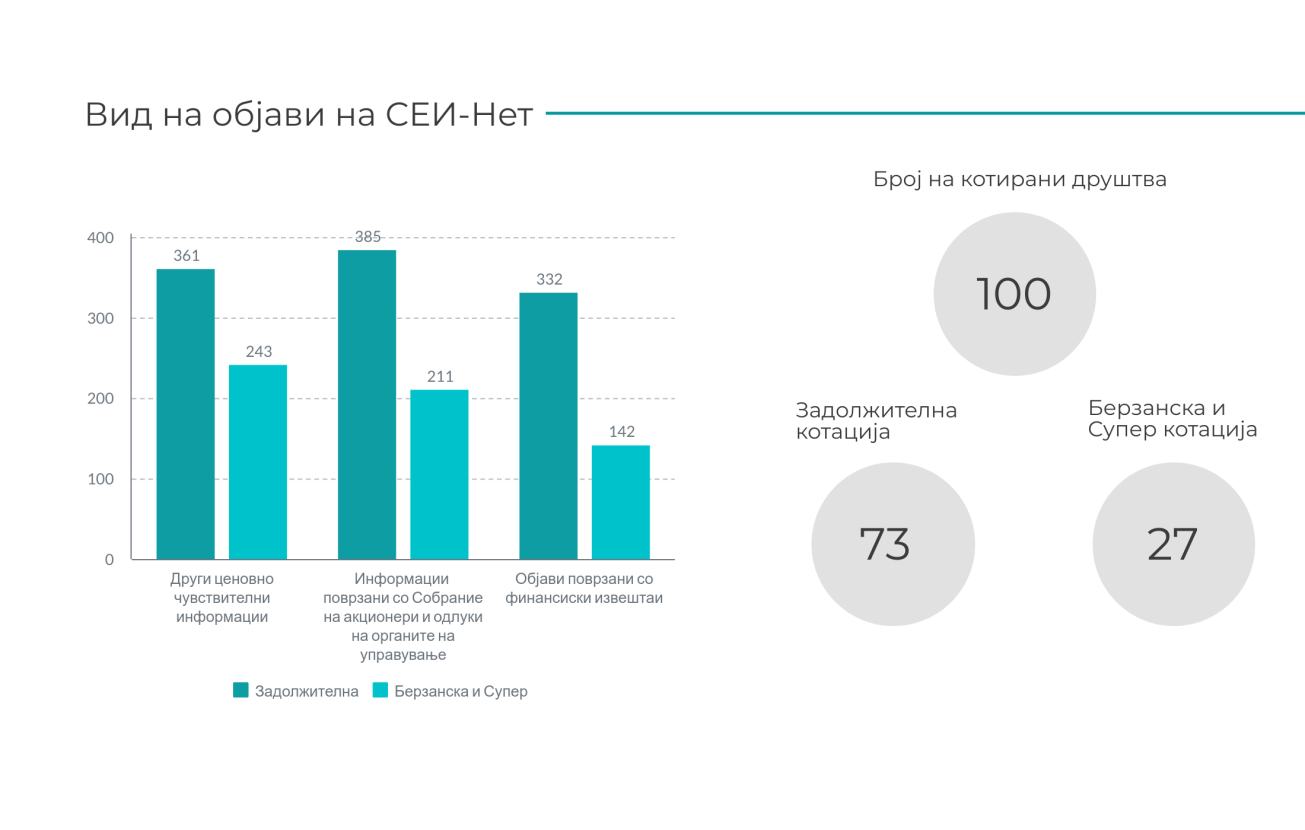 Во првите девет месеци од 2020 година котираните 100 акционерски друштва преку СЕИ-Нет објавија 1674 информации во врска со собранија на акционери, одлуки на органите на управување, финансиски извештаи и други ценовно чувствителни информации. Во третиот квартал од 2020 година, котираните компании објавија вкупно 428 објави на СЕИ-Нет.