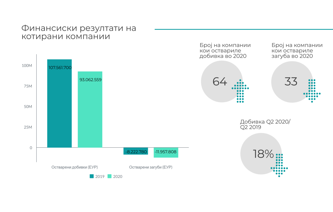 До крајот на август беа објавени и финансиските резултати на котираните компании за првата половина од 2020 година. Од 100 котирани компании, 64 регистрирале добивка, 33 загуба, додека 3 компании не доставиле финансиски извештај. Вкупната прикажана добивка на котираните компании за периодот I- VI 2020 година е намалена за околу 18% споредено со истиот период лани.