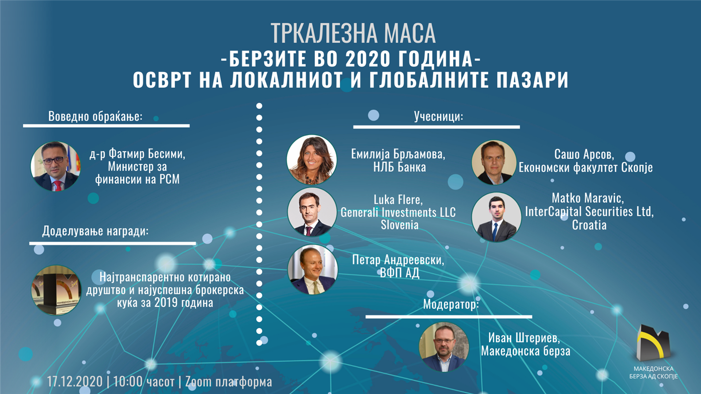 Македонска берза организира тркалезна маса на тема: „Берзите во 2020 година - Осврт на локалниот и глобалните пазари“.