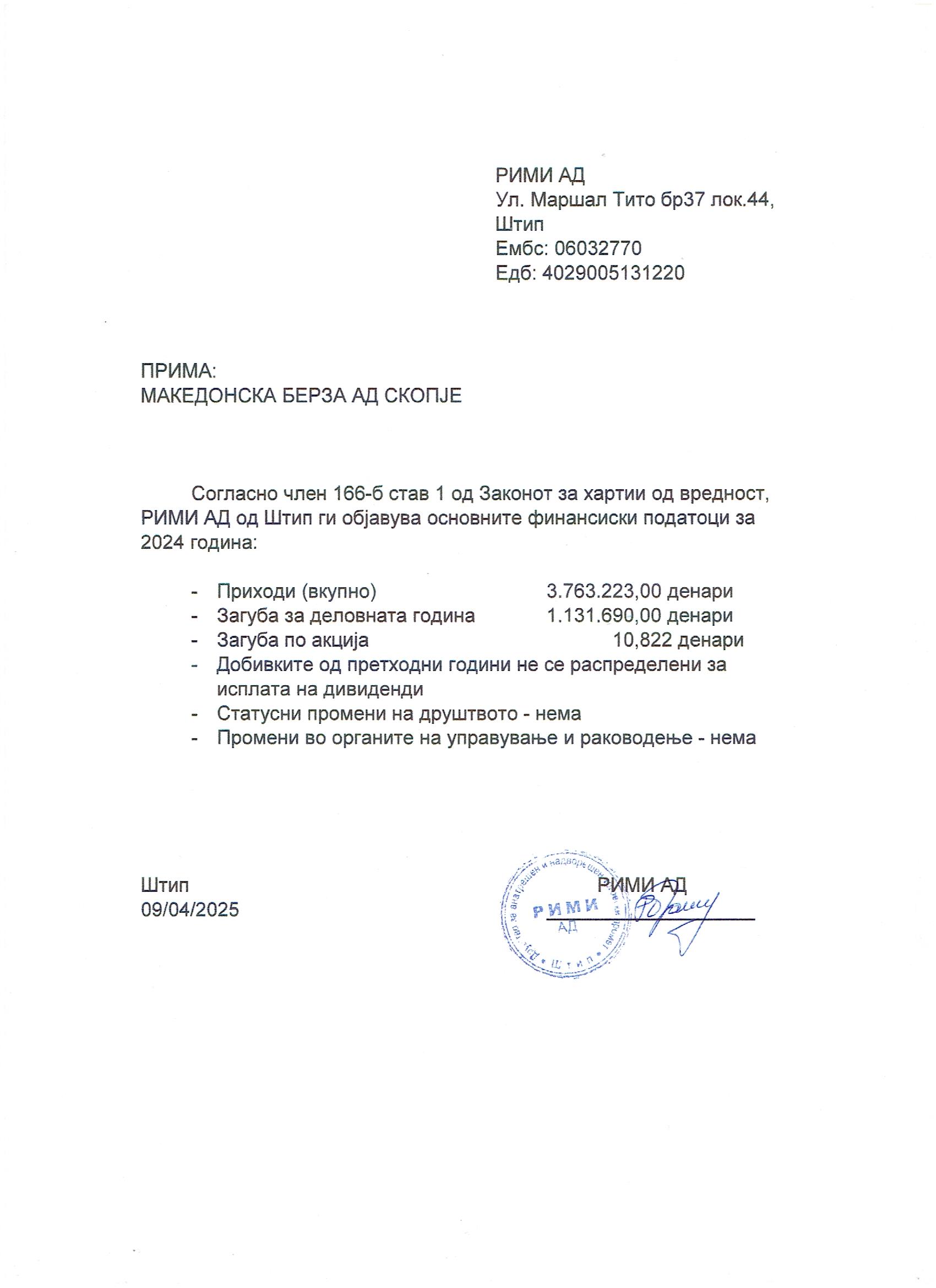 РИМИ АД Штип - Податоци од финансиски извештаи и дивиденда