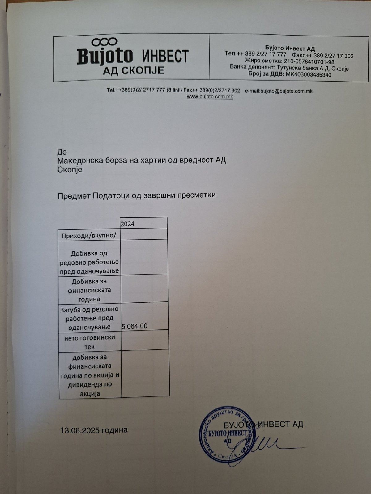 Бујото Инвест АД Скопје - Податоци од финансиски извештаи и дивиденда