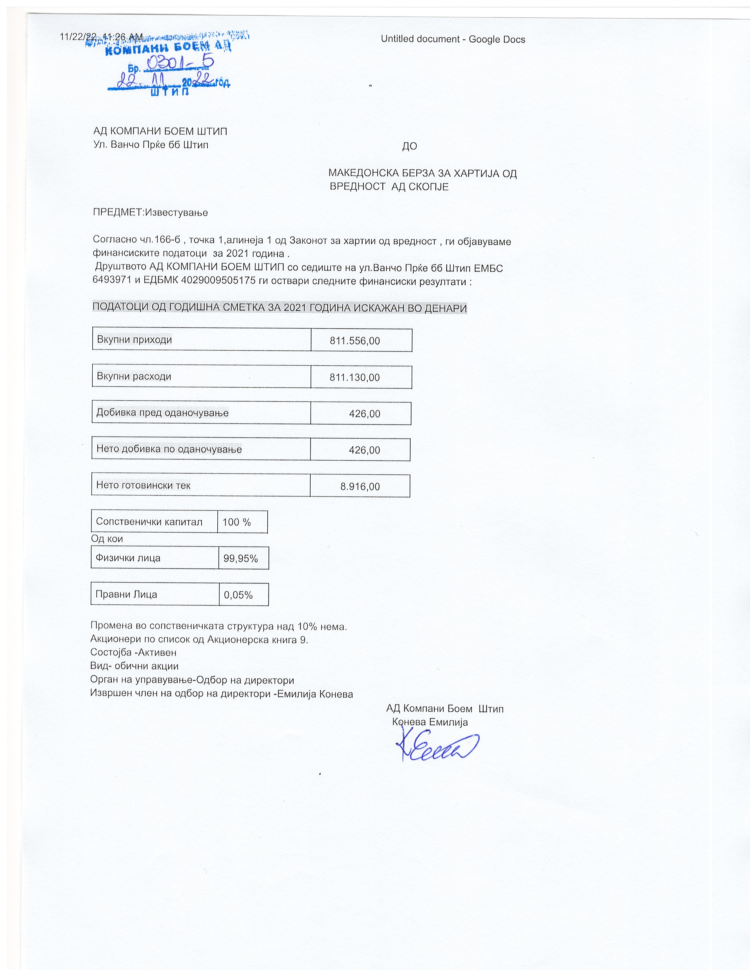 КОМПАНИ БОЕМ АД ШТИП - Податоци од финансиски извештаи и дивиденда