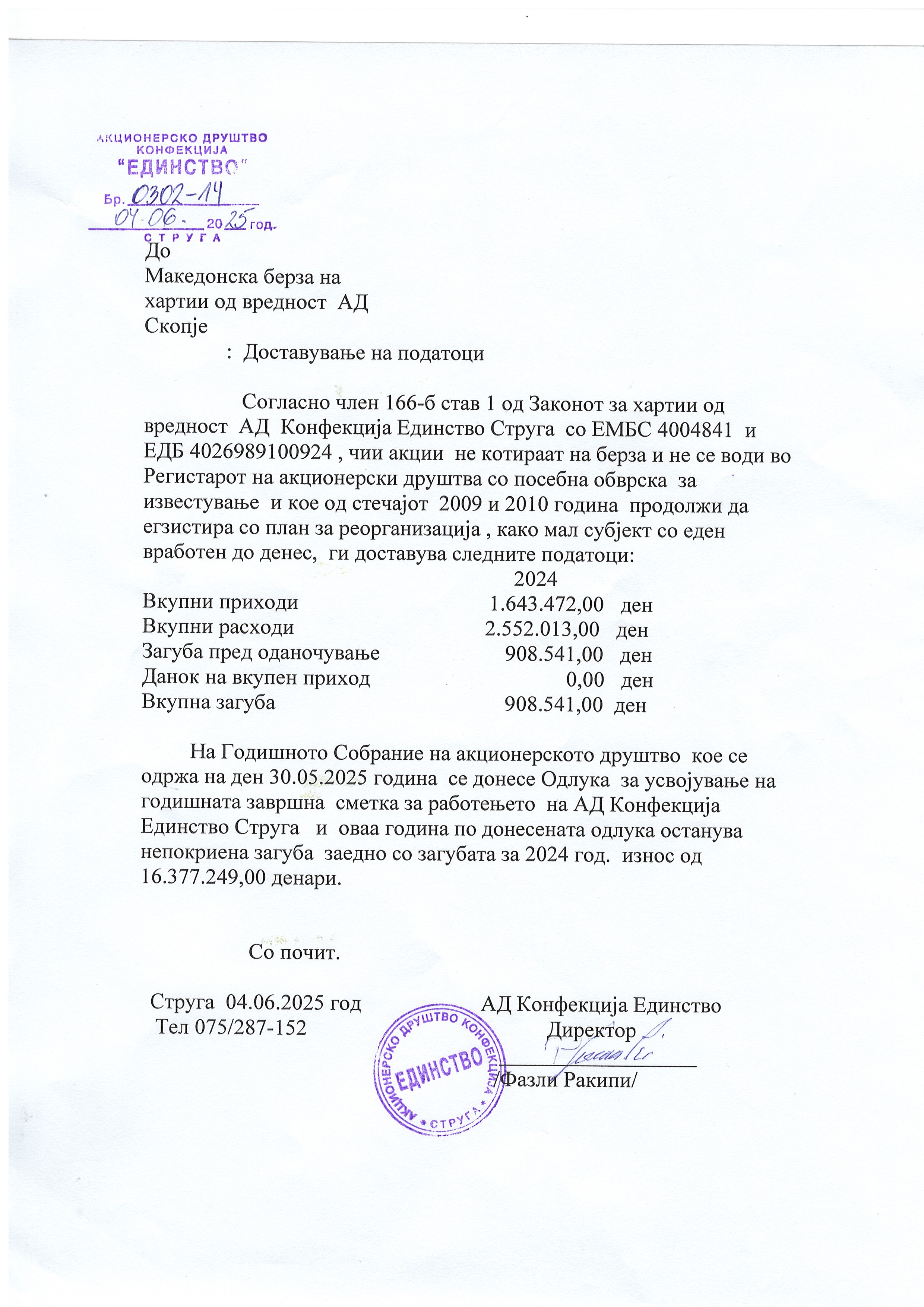 Согласно член 166-б, точка 1, алинеја 1 од Законот за Хартии од вредност ги објавуваме финансиските податоци и податоци за дивидендатa.