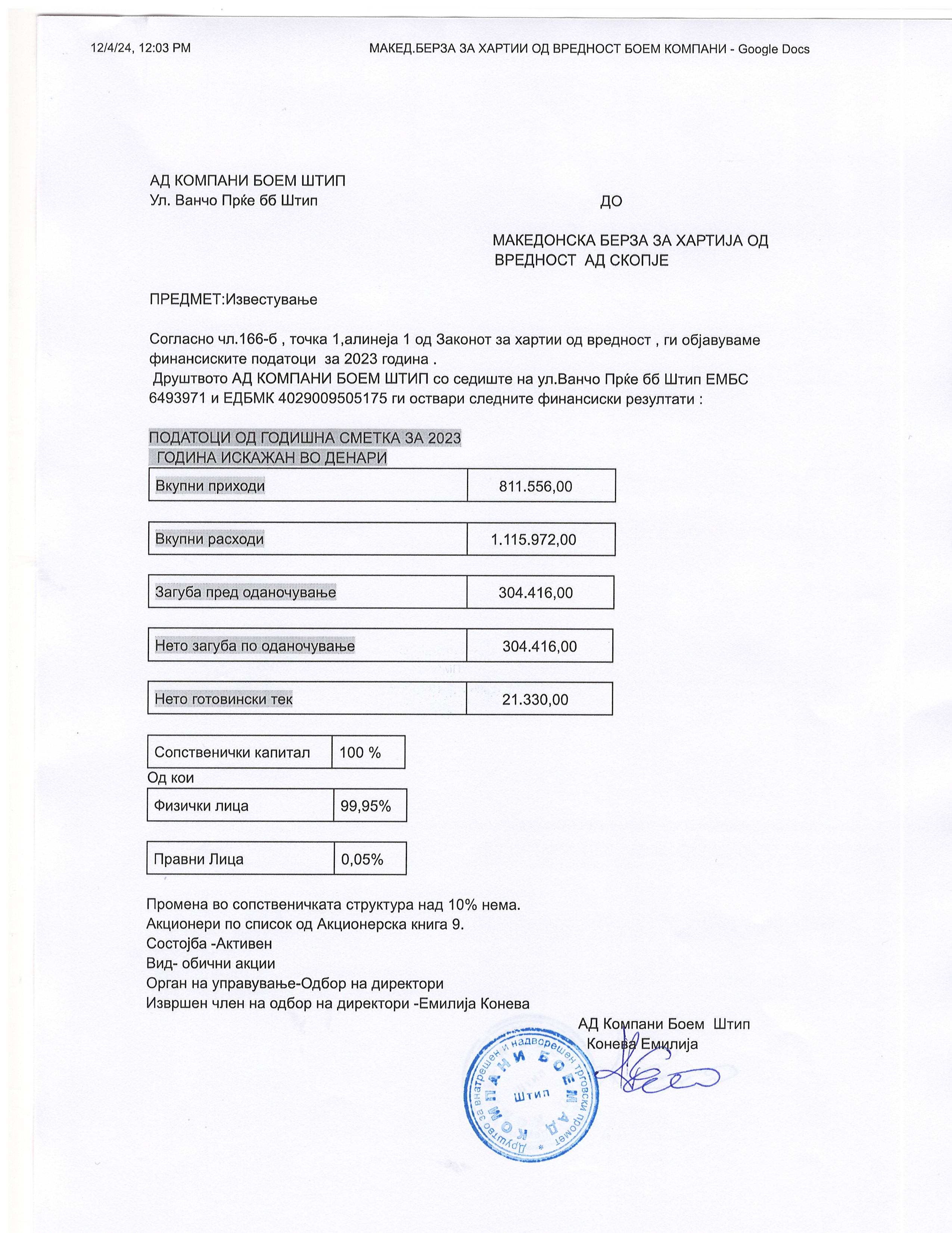 KOMPANI BOEM AD STIP - Financial data and dividends