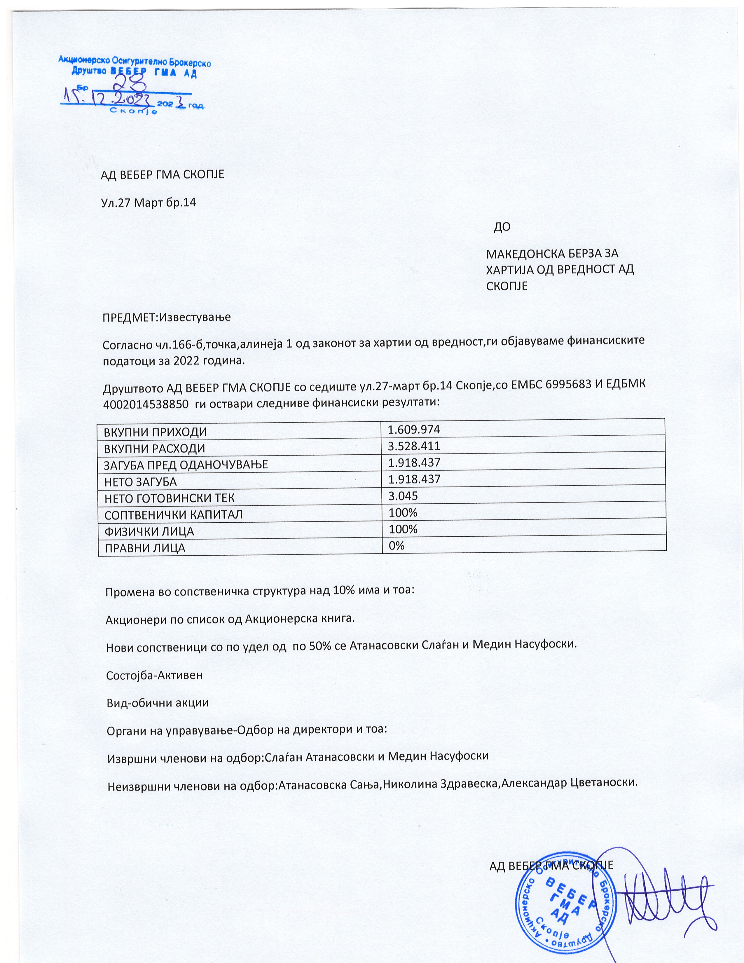 Вебер ГМА АД Скопје - Податоци од финансиски извештаи и дивиденда