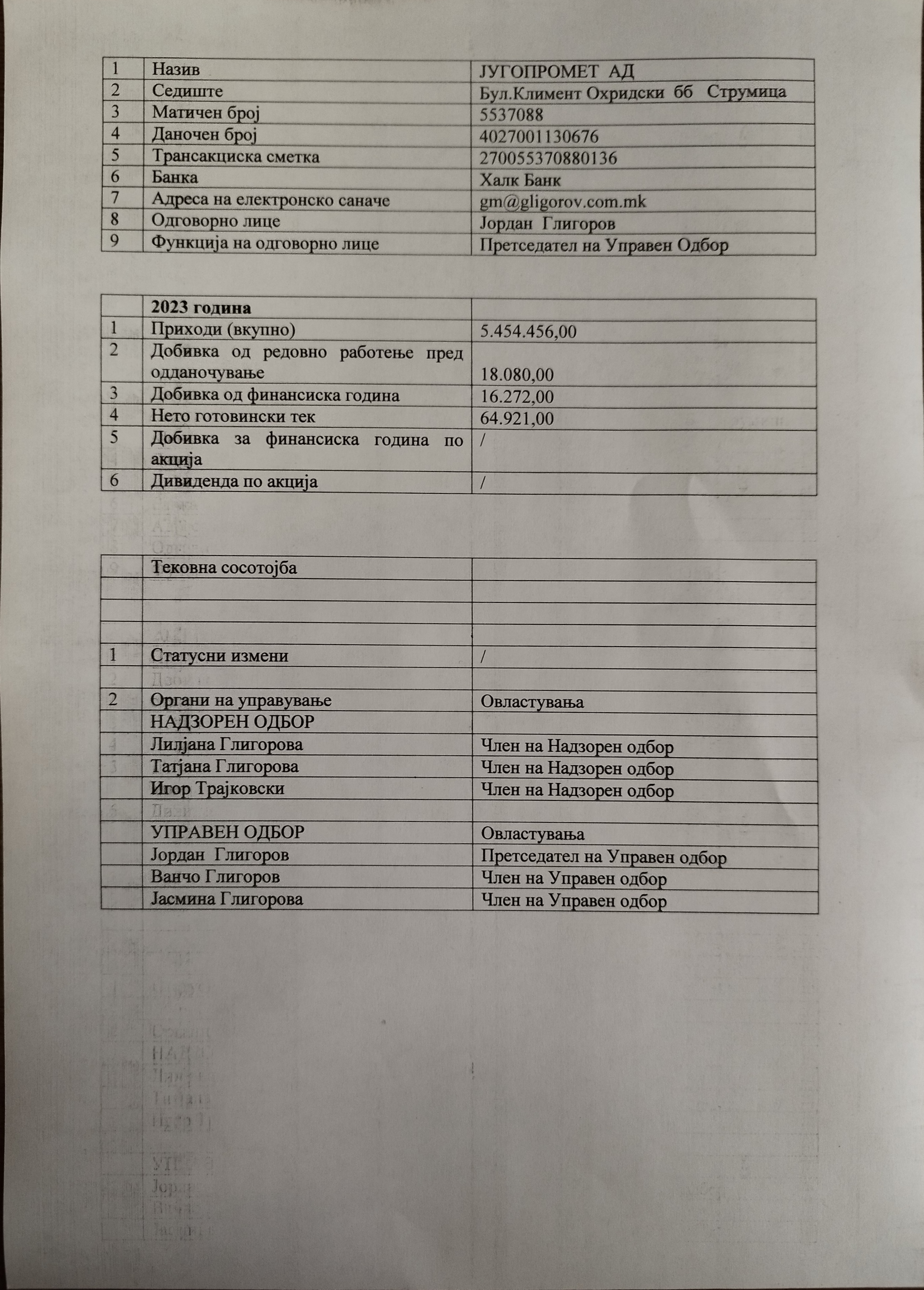 Југопромет АД Струмица - Податоци од финансиски извештаи и дивиденда