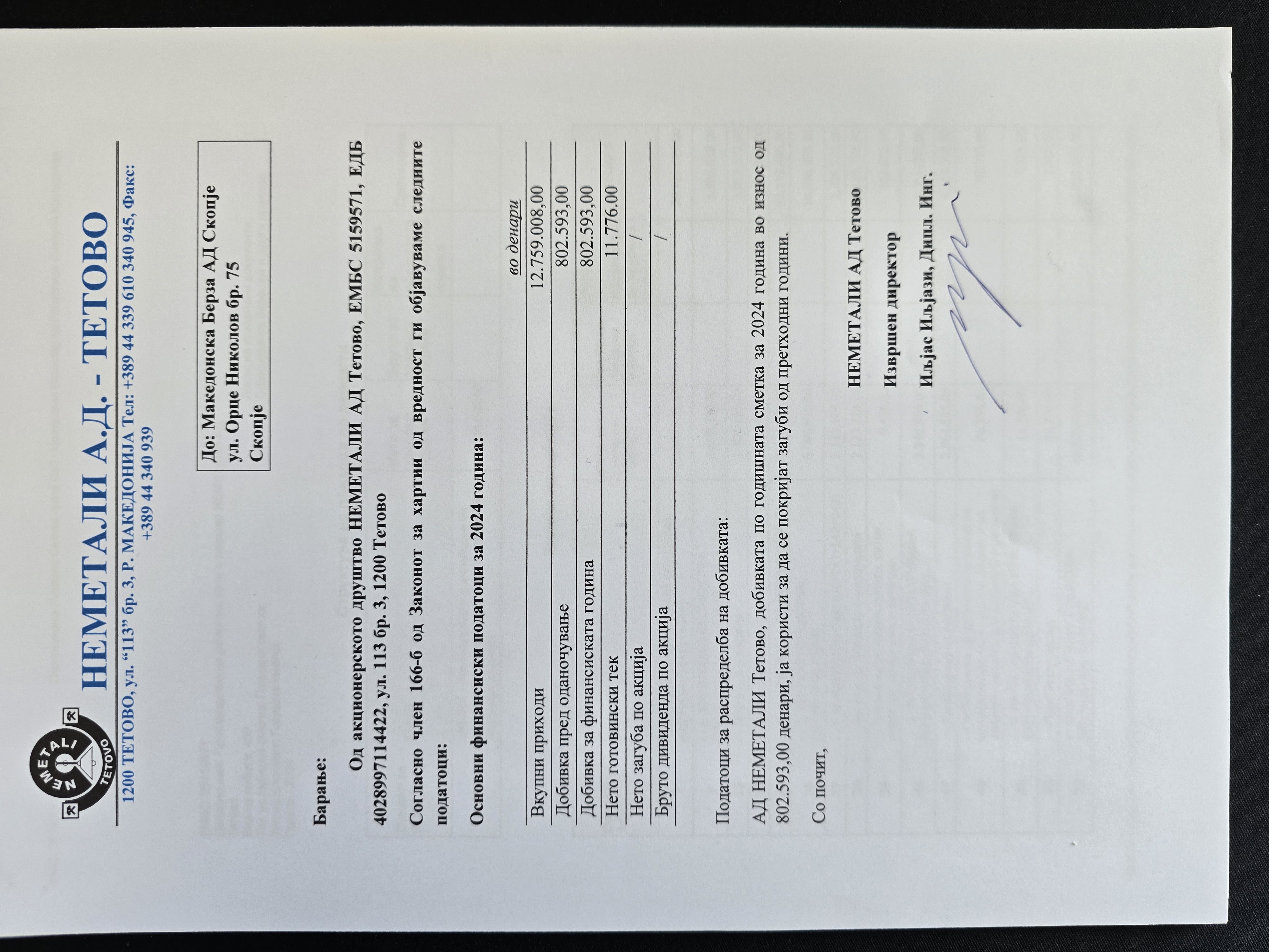 Неметали АД Тетово - Податоци од финансиски извештаи и дивиденда