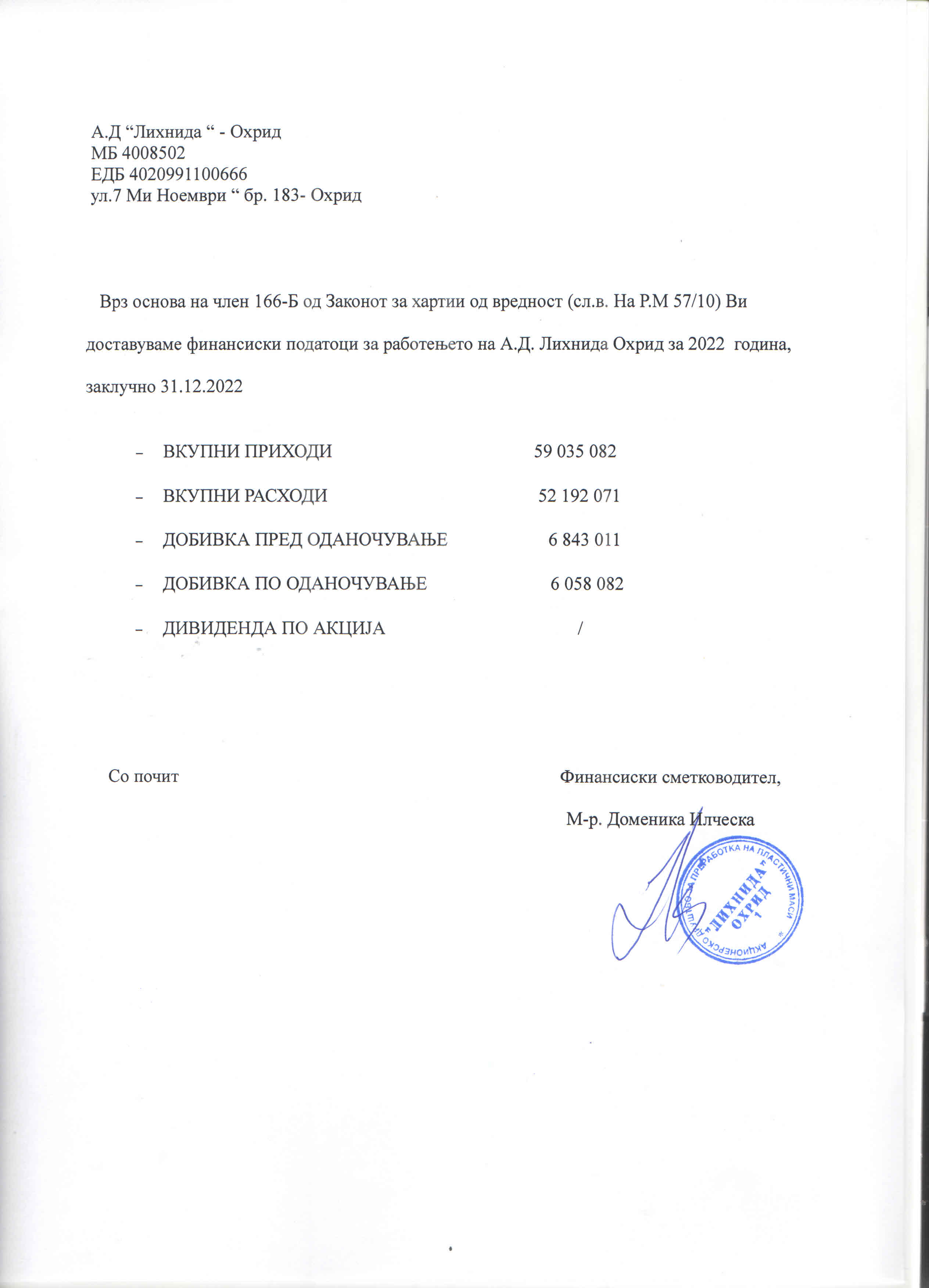 Лихнида АД Охрид - Податоци од финансиски извештаи и дивиденда