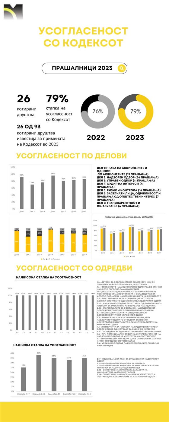 Во текот на 2024 година, котираните друштва коишто согласно Правилата за котација на Берзата се должни да известуваат за примената на Кодексот за корпоративно управување, по втор пат известија за неговата примена преку пополнување на соодветните прашалници во коишто ги опишуваат нивните корпоративни практики во текот на изминатата 2023 година. Анализата на нивните одговори покажува дека просечната стапка на усогласеност на корпоративното управување на сите друштва со Кодексот во 2023 година е 79%.