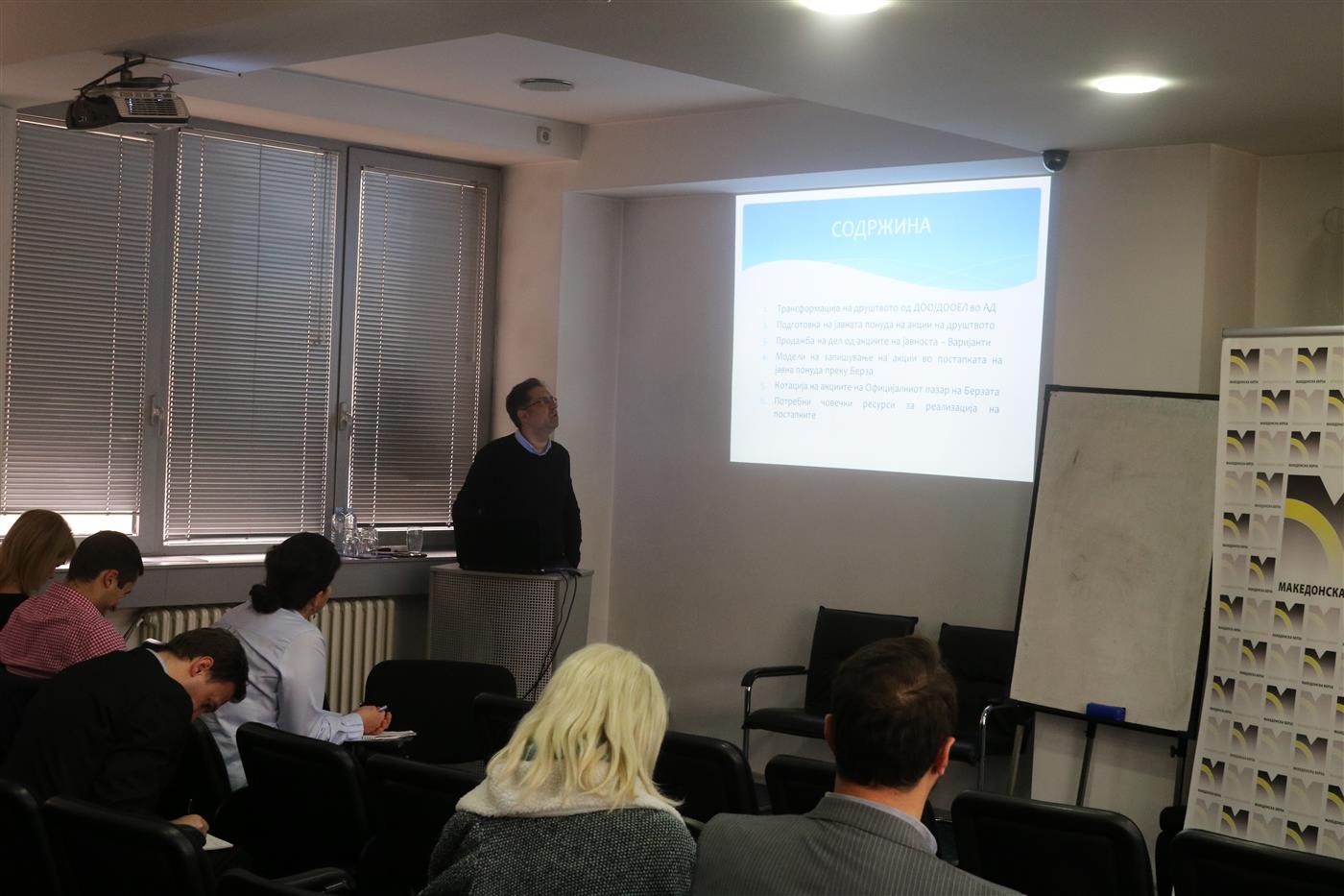 Работилницата имаше за цел генерално да ја објасни целокупната постапка за издавање на сопственички хартии од вредност (акции) по пат на јавна понуда и постапката за нивна котација на берза. Со програмата беа опфатени вообичаените постапки што се применуваат при издавање на хартии од вредност во меѓународната пракса, при што истовремено се стави акцент на деловите кои се карактеристични и се застапени во моменталната домашна правна рамка.